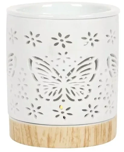 Ce brûleur à huile en céramique mate présente un joli détail de papillons et une base en céramique avec une finition effet bois lui donnant une allure contemporaine.