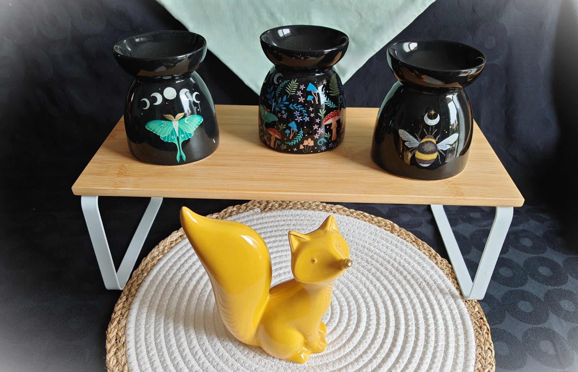 Superbe brule-parfum en céramique noire orné d’une abeille de la forêt, qui prend vie sous la lueur de la lune et des étoiles.