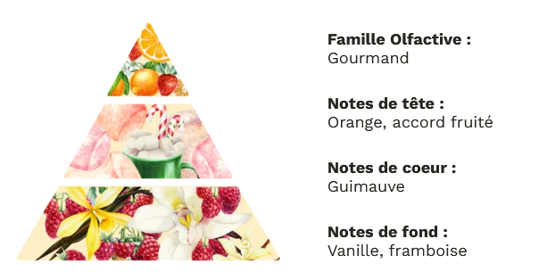 Succombez à la douceur de la guimauve, rehaussée par des notes fruitées d'orange et enveloppée dans un cocon sucré de vanille et de framboise, offrant une expérience gourmande et réconfortante.